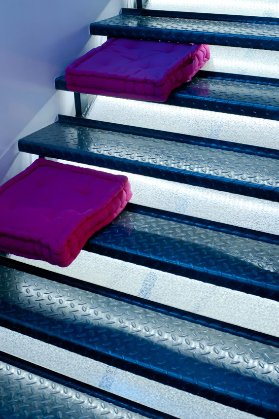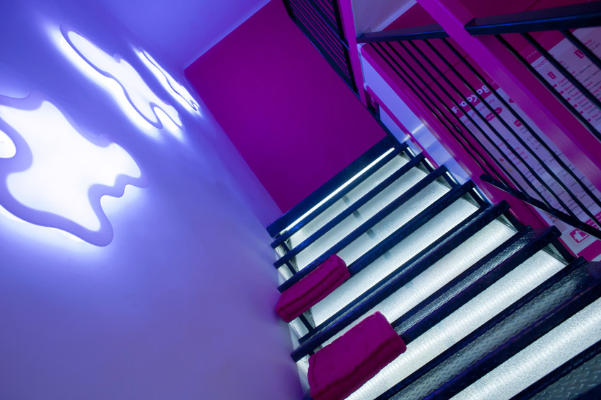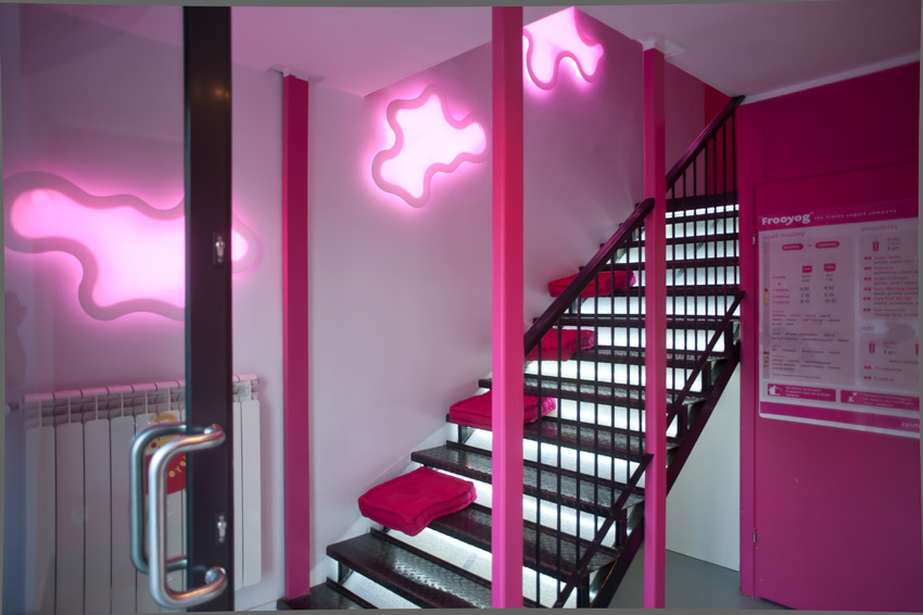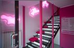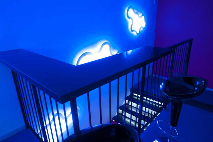Naszym zadaniem było podświetlenie dekoracyjne schodów, lady oraz wykonanie dekoracyjnych elementów świecących w postaci chmurek podświetlanych diodami RGB. Instalacja pozwala na sterowanie kolorem 7 chmurek rozmieszczonych w różnych miejscach na 2 piętrach lokalu