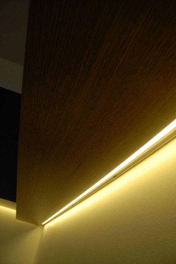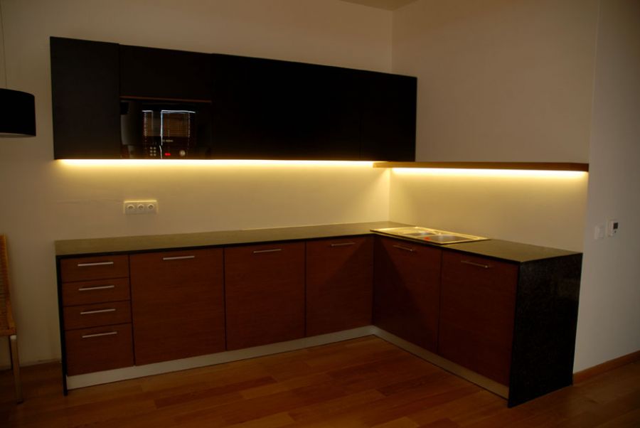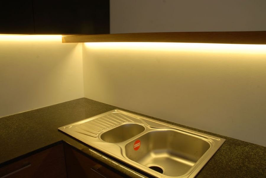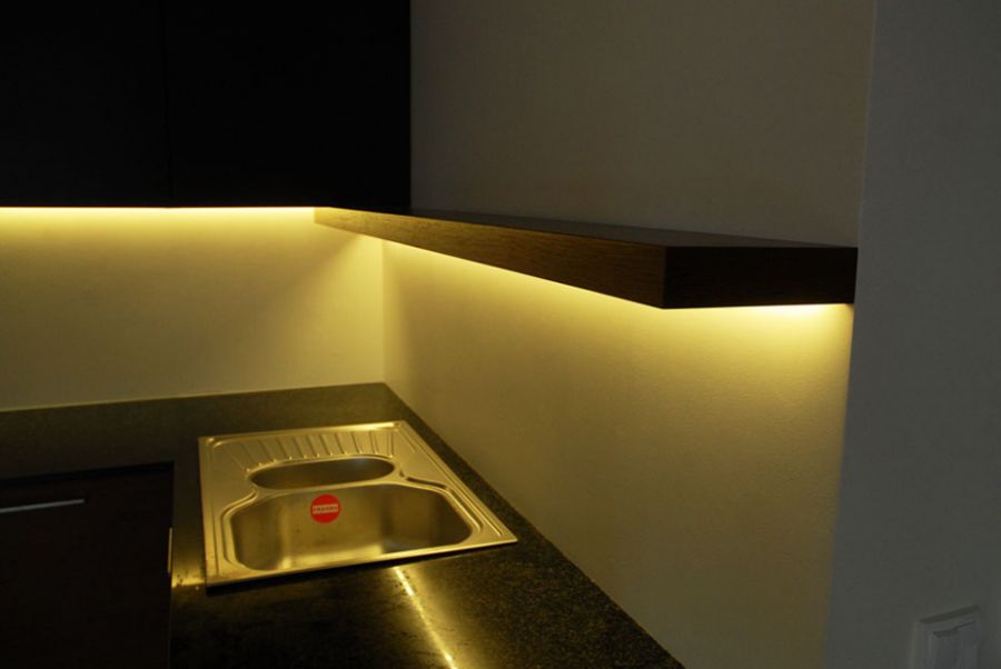 Użyto taśm diodowych o wysokiej gęstości (96 diody/metr) umieszczonych w profilach aluminiowych z przykryciem z mlecznego plexi. Profile zostały wklejone w kanał wyfrezowany w tylnej częsci dna szafek i półki tworząc linię światła niewidoczną bezpośrednio podczas korzystania z kuchni. Łączna moc instalacji wynosi ok. 40W.