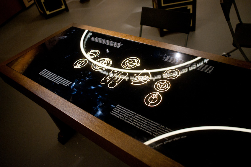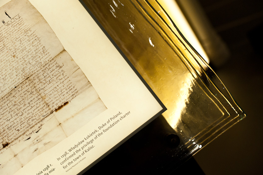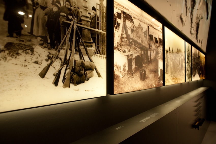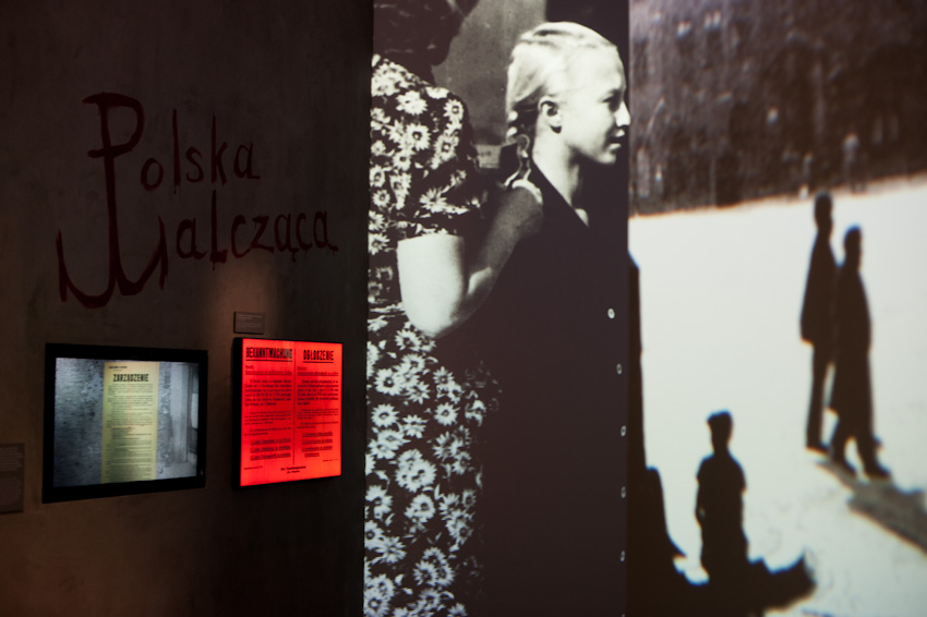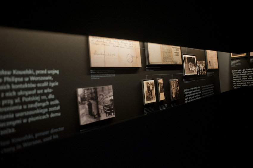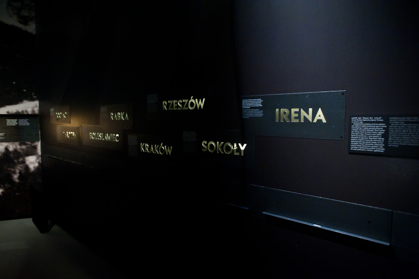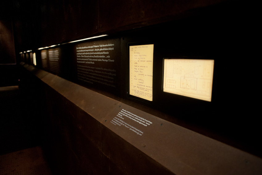 Wykonaliśmy i zamontowaliśmy niemal 300 świecących elementów ekspozycyjnych i podświetleń. Ustalenia, prace przygotowawcze, tworzenie prototypów -trwały prawie rok. Montaż rozpoczęliśmy w styczniu 2014, ostatnie elementy zostały zamontowane 22.10.2014. Przygotowana przez nas dokumentacja powykonawcza liczy 170 stron. Największą grupę obiektów stanowią tzw. lightboxy - rodzaj podświetlanych od środka kasetonów. Jest ich na wystawie w sumie 221, niemal każdy ma inne wymiary (od 8x8 cm do 50 x 264 cm), każdy zbudowany jest z kilkunastu ręcznie składanych elementów. Każdy z lighboxów i niemal wszystkie podświetlania mają regulowaną jasność. Służą do tego zaprojektowane i wykonane przez nas sterowniki PWM. Natężenie płynącego prądu determinujące poziom jasności diod w danym odbiorniku jest regulowane na dwa sposoby: centralnie, za pomocą sygnału DMX podawanego na wejście DMX z zewnętrznej konsoli sterującej lub za pomocą sygnału typu RFID transmitowanego lokalnie z pilota do anteny odbiorczej. Takie podejście umożliwia zarówno centralne sterowanie jasnością wszystkich odbiorników jak i lokalne adresowanie i ustawianie jasności każdego z nich. Nie jest nam znany przykład podobnego rozwiązania produkowanego przez jakąkolwiek inną firmę na świecie. Sterownik PWM jest zasilany napięciem 12V DC, realizuje modulację z częstotliwością 2,5 kHz, co gwarantuje świecenie bez efektu migotania zarówno dla oka ludzkiego jak i dla typowych kamer video i ma 8-bitową (256 stopniową) skalę ustawień jasności. Faktycznie poziom jasności jest ustawiany z dokładnością 10 bitową ( 1024 poziomy) dzięki czemu zaprogramowana charakterystyka ściemniania jest nieliniowa, zgodna z krzywą percepcji wzroku (mniejsze zmiany jasności w dolnej części skali, większe w górnej). We wszystkich wykonanych przez nas elementach ekspozycyjnych źródłem światła sa diody LED, z wyjątkiem tylko dwóch obiektów - latarń w tzw. Uliczce. Tam dla uzyskania dawnego klimatu i niewielkiej ilości światła użyliśmy zwykłych żarówek 25W wyposażonych w wyprodukowane przez ALLED ściemniacze tyrystorowe. Podsumowując: całe oświetlenie wystawy stałej, poza tzw. oświetleniem bytowym, oświetleniem z szyno-przewodów, oświetleniem gablot i oświetleniem kilku dodatkowych elementów ekspozycyjnych zostało wykonane przez firmę ALLED.