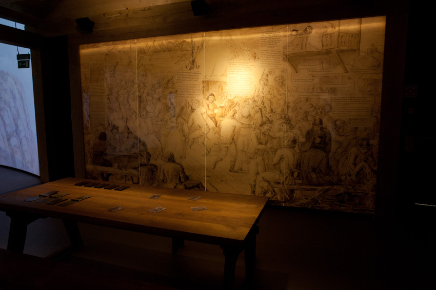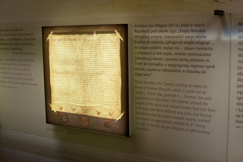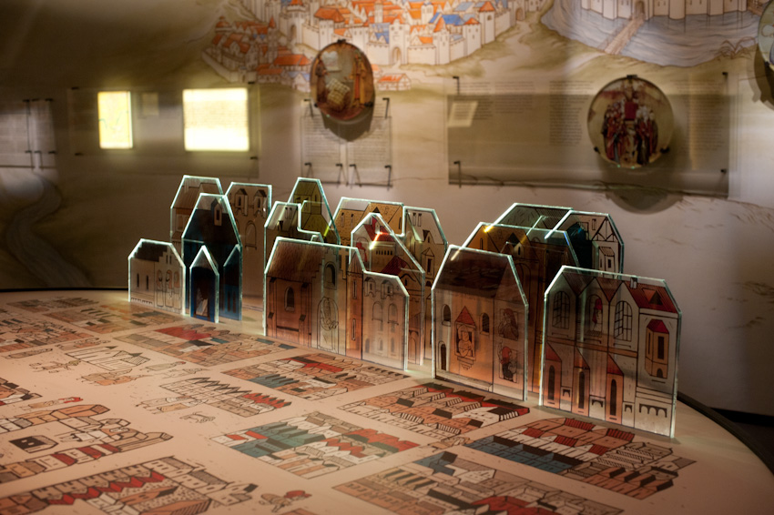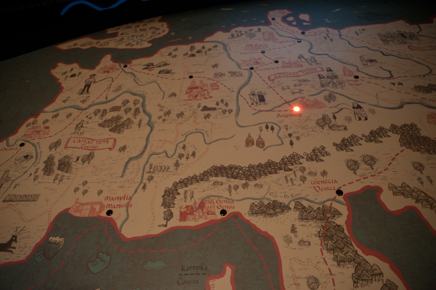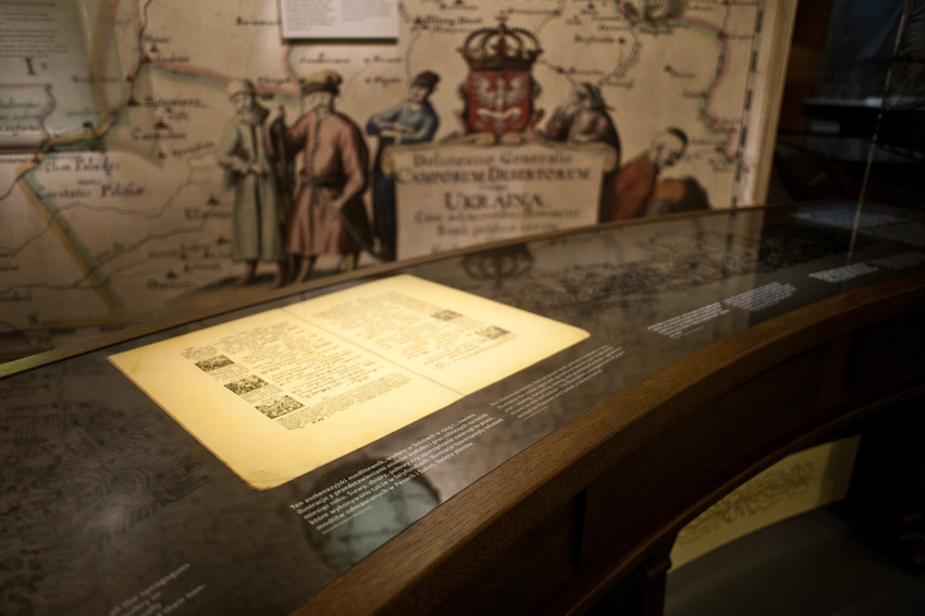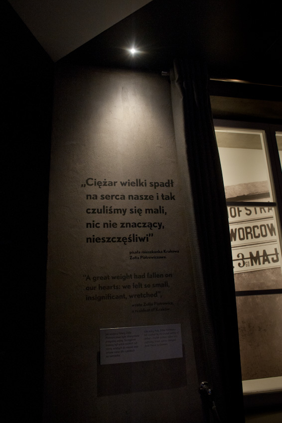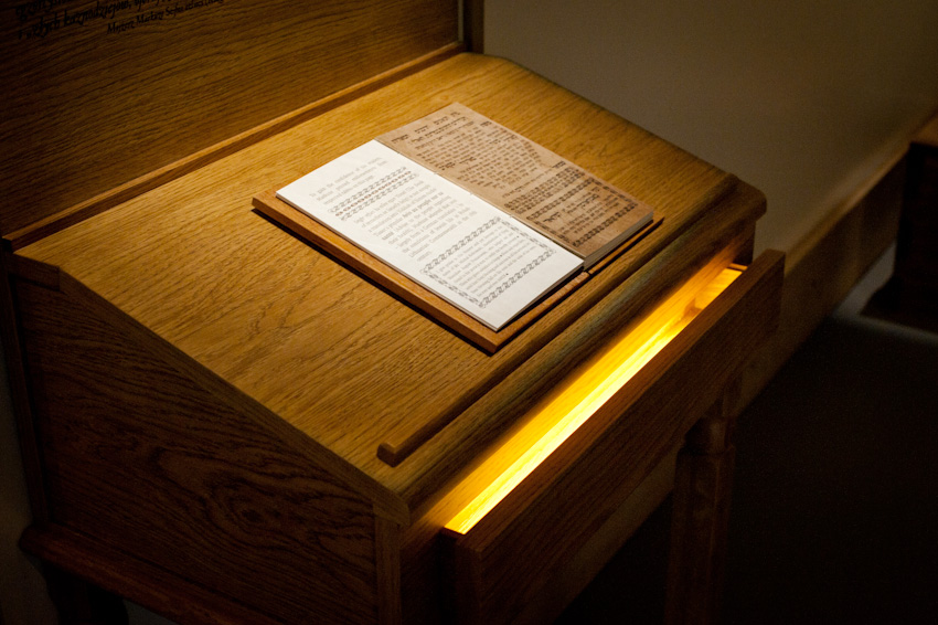 Wykonaliśmy i zamontowaliśmy niemal 300 świecących elementów ekspozycyjnych i podświetleń. Ustalenia, prace przygotowawcze, tworzenie prototypów -trwały prawie rok. Montaż rozpoczęliśmy w styczniu 2014, ostatnie elementy zostały zamontowane 22.10.2014. Przygotowana przez nas dokumentacja powykonawcza liczy 170 stron. Największą grupę obiektów stanowią tzw. lightboxy - rodzaj podświetlanych od środka kasetonów. Jest ich na wystawie w sumie 221, niemal każdy ma inne wymiary (od 8x8 cm do 50 x 264 cm), każdy zbudowany jest z kilkunastu ręcznie składanych elementów. Każdy z lighboxów i niemal wszystkie podświetlania mają regulowaną jasność. Służą do tego zaprojektowane i wykonane przez nas sterowniki PWM. Natężenie płynącego prądu determinujące poziom jasności diod w danym odbiorniku jest regulowane na dwa sposoby: centralnie, za pomocą sygnału DMX podawanego na wejście DMX z zewnętrznej konsoli sterującej lub za pomocą sygnału typu RFID transmitowanego lokalnie z pilota do anteny odbiorczej. Takie podejście umożliwia zarówno centralne sterowanie jasnością wszystkich odbiorników jak i lokalne adresowanie i ustawianie jasności każdego z nich. Nie jest nam znany przykład podobnego rozwiązania produkowanego przez jakąkolwiek inną firmę na świecie. Sterownik PWM jest zasilany napięciem 12V DC, realizuje modulację z częstotliwością 2,5 kHz, co gwarantuje świecenie bez efektu migotania zarówno dla oka ludzkiego jak i dla typowych kamer video i ma 8-bitową (256 stopniową) skalę ustawień jasności. Faktycznie poziom jasności jest ustawiany z dokładnością 10 bitową ( 1024 poziomy) dzięki czemu zaprogramowana charakterystyka ściemniania jest nieliniowa, zgodna z krzywą percepcji wzroku (mniejsze zmiany jasności w dolnej części skali, większe w górnej). We wszystkich wykonanych przez nas elementach ekspozycyjnych źródłem światła sa diody LED, z wyjątkiem tylko dwóch obiektów - latarń w tzw. Uliczce. Tam dla uzyskania dawnego klimatu i niewielkiej ilości światła użyliśmy zwykłych żarówek 25W wyposażonych w wyprodukowane przez ALLED ściemniacze tyrystorowe. Podsumowując: całe oświetlenie wystawy stałej, poza tzw. oświetleniem bytowym, oświetleniem z szyno-przewodów, oświetleniem gablot i oświetleniem kilku dodatkowych elementów ekspozycyjnych zostało wykonane przez firmę ALLED.