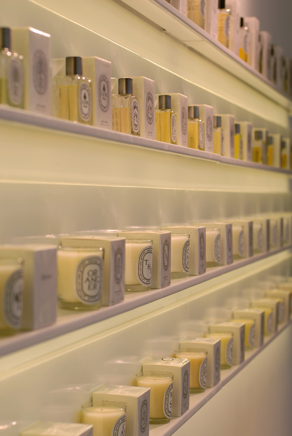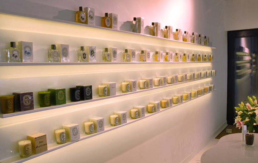 Ponieważ półki są podświetone całą dobę, stanowiąc w nocy jedyne oświetlenie wnętrza salonu, celowy był wybór jak najwydajniejszego źródła światła.