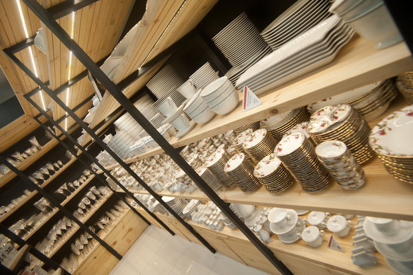 Naszym zadaniem było podświetlenie niemal 150m półek w regałach do ekspozycji porcelany. Podświetlane regały są rozmieszczone wzdłuż wszystkich ścian sklepu oprócz witryny.