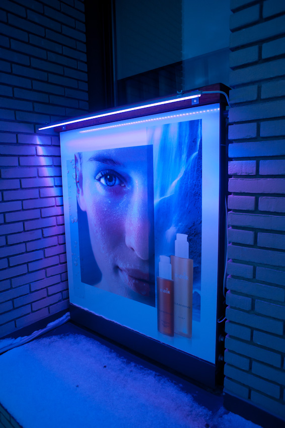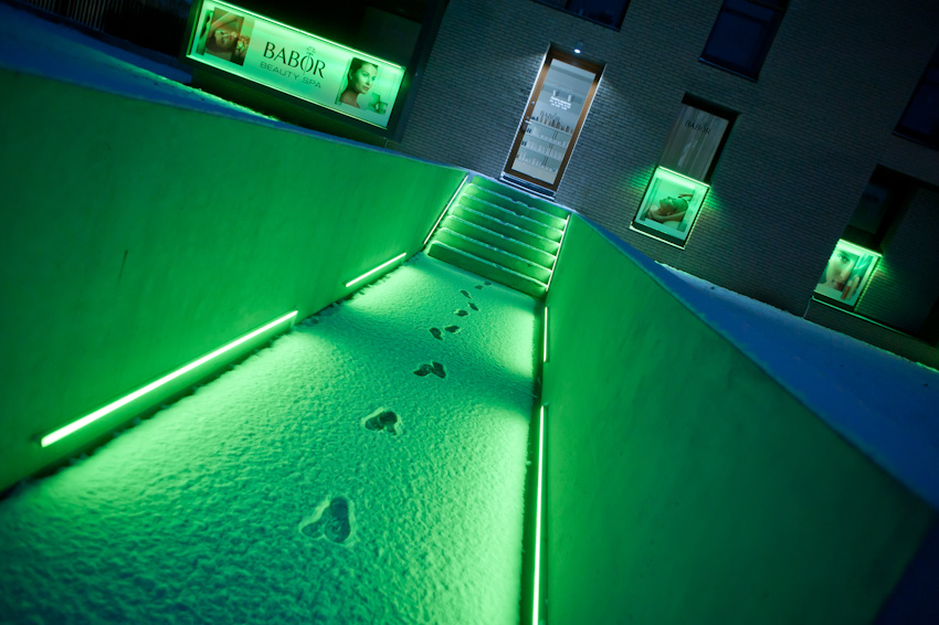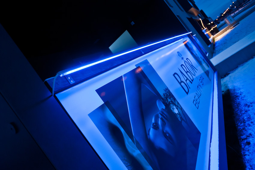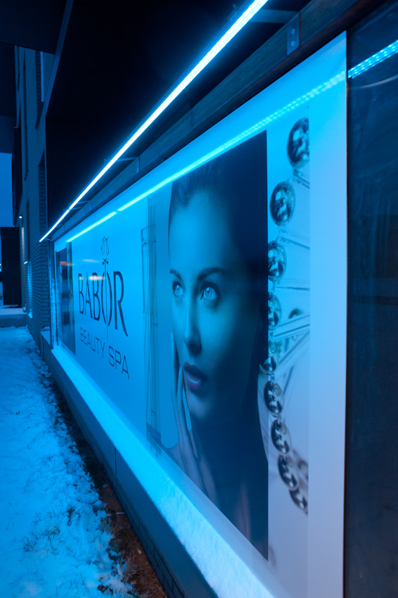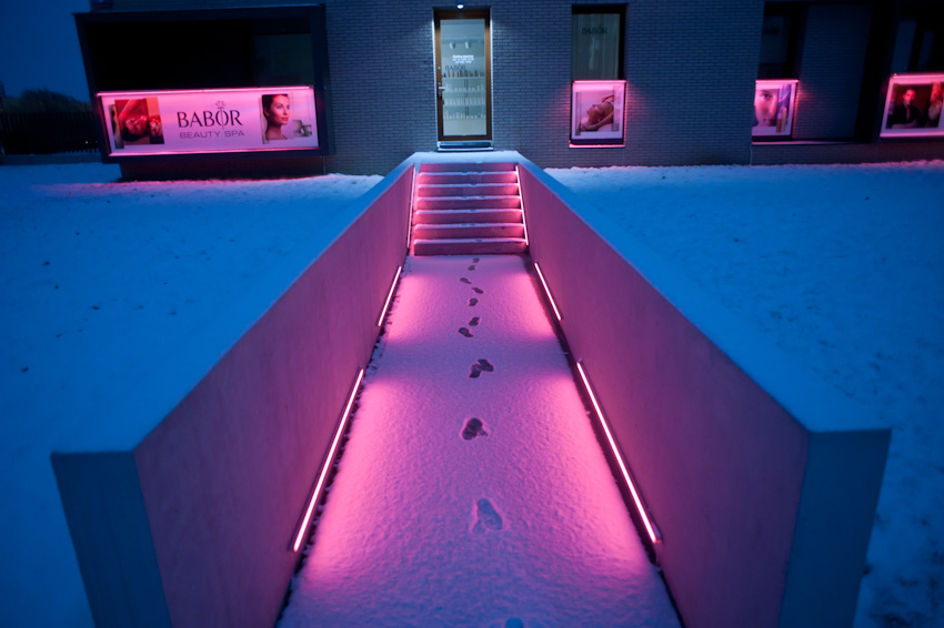 Naszym zadaniem było oświetlenie ścieżki prowadzącej do Spa oraz podświetlenie wydruków reklamowych umieszczonych na czterech balkonach salonu. Kolor podświetlenia można zmieniać, zarówno ustawiając ręcznie wybraną barwę jak i w trybie automatycznych zmian z regulowaną prędkością. Wszystkie oświetlacze użyte w tej realizacji świecą się w danej chwili w tej samej barwie. Ponadto nad wejściem do salonu zamontowaliśmy dodatkowo mały oświetlacz LED świecący na biało.